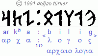suskunluk içinde geçen iki yılı aşkın süre sonra, Onun paleografik yorumlar bakımından sizin için ilginç olacağını düşündüm; böyle bir olasılık üzerindeki değerli düşünceniz önem taşıyacaktır. Durum arcaiologikh, archaeology’de olduğu üzere arch, archi (başlangıç); arcaikh, archaic (arkaik) gibi Grek sözcükleri ile ilişkilidir. Uzun bir süre önce bu sözcüğü bizim eski Orkhun harfleri (damgaları) ile Türkçede arka (eski / antik / geçmiş {zaman} / arkada {kalan çağlar} + biligi (bilgi / bilim) olarak düzenleyip sunmuştum. Biçimde Yunan yazısı ile belli belirsiz bir benzerlik (archai ~ arka ve ology ~ biligi) ataların geldiği çok daha eski ve ortak bir kaynağı gösterir gibidir. Bu sonucu websitemde yayınlamıştım [Fig. 1].