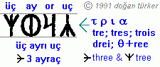 © 1991 doğan türker üç.er.am.ingi * Türk evrendoğumu’nda (cosmogenesis) Oğhuz Khan+(am)’ın am.er.okh (ana, baba, çocuk ~ aleph, beth, gimel) @ okh.er.am (gün, ay, yıldız & gök, dağ, deniz ~ ar. keram+et; gr. keramik) buyruğu ile dile getirdiği üç erim iminin incisi (yaratılış & var oluş & yok oluş) is.im. öge’si (isim / imge / öge & simgeleri), üç yer’in üç er can’a & üç er can’ın üç yer’e / ış.(oğh.or).am : al.am, uğurlu ışığın şu(ğ)ur ışım alavı ya da çıra(m) > ar. meş’ale{v}; eng. torch (of enlightment); hint. shamballa, gibi gökten at.ut+uç. or.okh (ateşli ucu tutuşarak) erimi & inişi; havaya, suya, topraka düşen üç oğh.uz. am : ing.(ök).erk’i (cosmic energy); üç cemre; theol. üçlem; > ar. teslis; eng. trinity; Bkz: oğh.er.am
